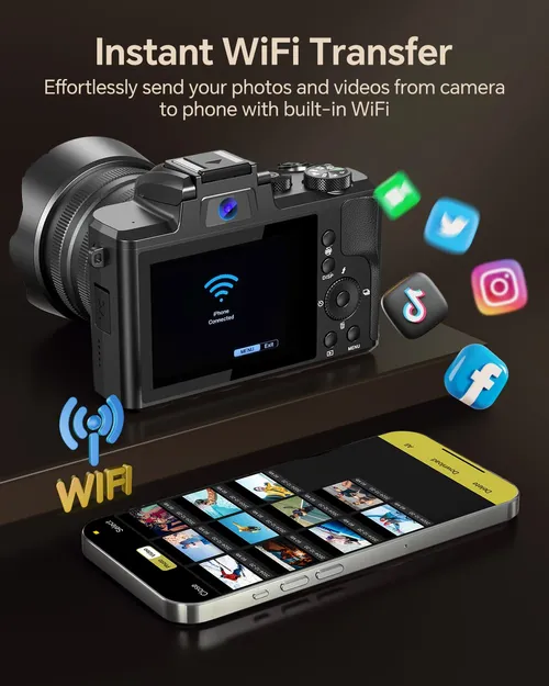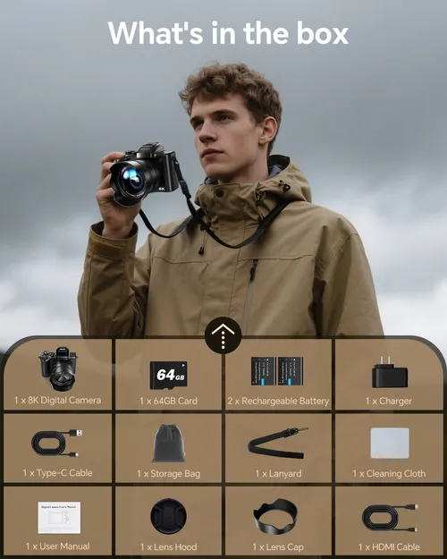 8K digital camera for photography, 88MP autofocus WiFi vlogging camera for YouTube videos, with front and rear lenses, flash, touch screen, lens, 64GB card, 2 batteries